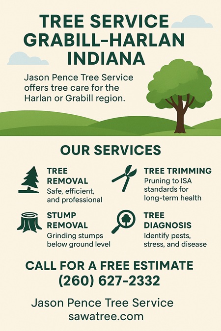If you a homeowner in Grabill, Indiana, a business owner searching for tree service Harlan, or anyone in need of dependable tree service Grabill-Harlan, call Jason Pence Tree Service today. Estimates are always free, and our reputation is built on trust and results. We are proud to serve our neighbors in Grabill, Harlan, and throughout Northeast Indiana with professional tree care since 1992.